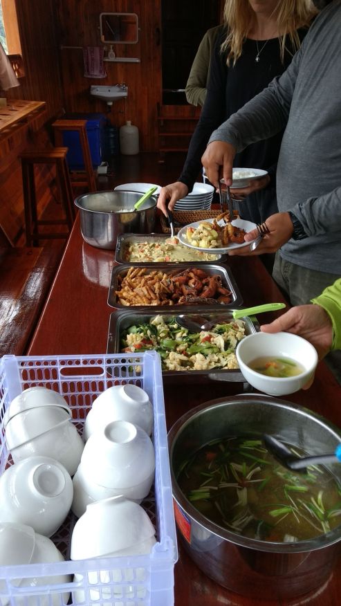 However, the boat we boarded was fantastic. I thought I was on the wrong cruise! Spacious timber bench seats and tables, comfy cushions and blankets (for if it got a little cool). Up front and back there were day beds if you fancied a lay down. There were bananas & mandarins available to snack on, free water, tea and coffee and a bar for purchasing snacks, soft drinks and beer. To top it off we also had 4 toilets (2 squat, 2 western).